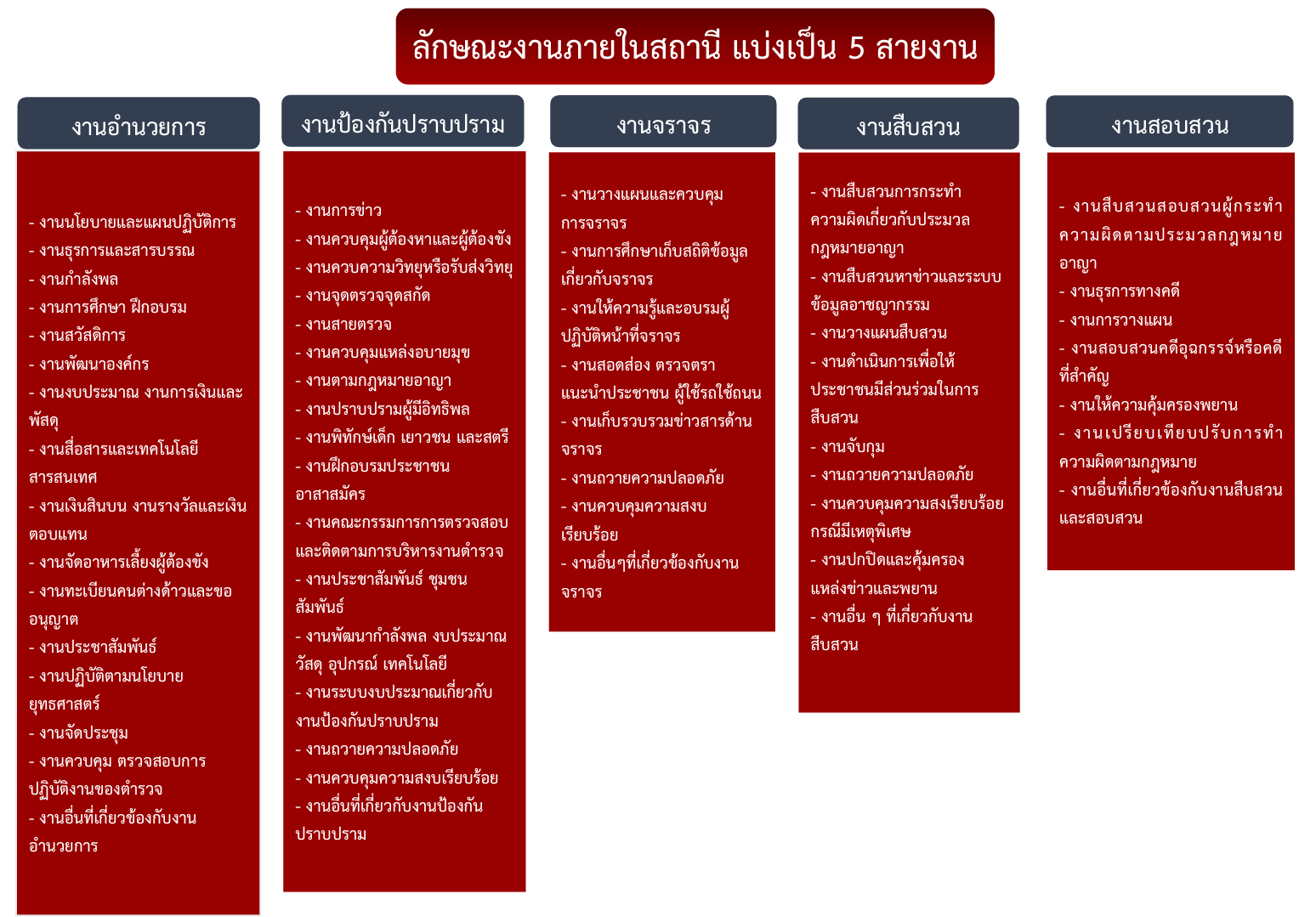 5. ปฏิบัติการอื่นใดตามที่กฎหมายกำหนดให้เป็นหน้าที่ของตำรวจหรือสำนักงานตำรวจแห่งชาติ